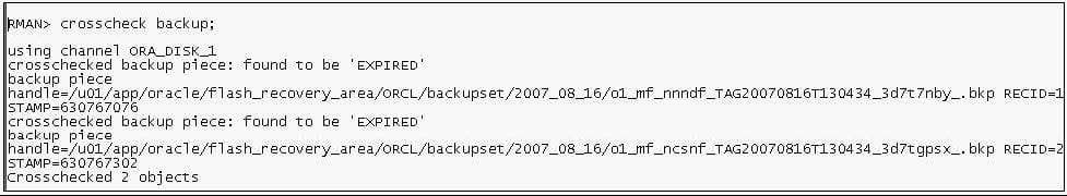 View the Exhibit to examine the output for the CROSSCHECK BACKUP command.
