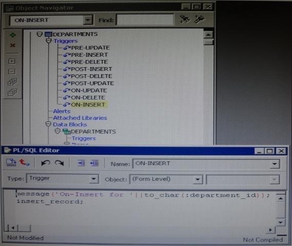 The Departments form has form level triggers defined as shown in the Exhibit. You have enabled array DML for the Departments block by setting its DML array size to 5 and setting the Primary Key property of Department id to Yes. You set runtime preferences for Forms Builder to use array processing.