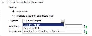 The Open Requests for Resource's portlet lists unstaffed assignments involving roles on the selected role team. Identify two ways that the portlet display can be organized.