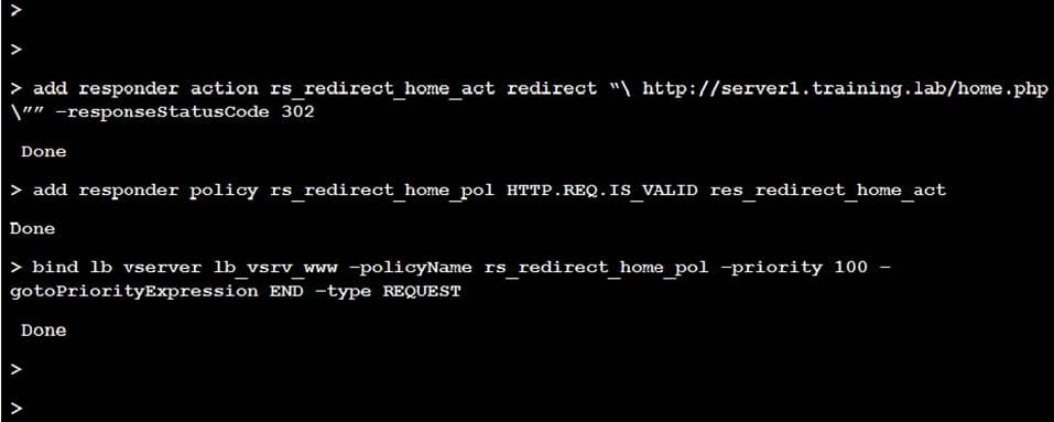 A Citrix Administrator configured the Responder policy to redirect the request for root page to the home page.