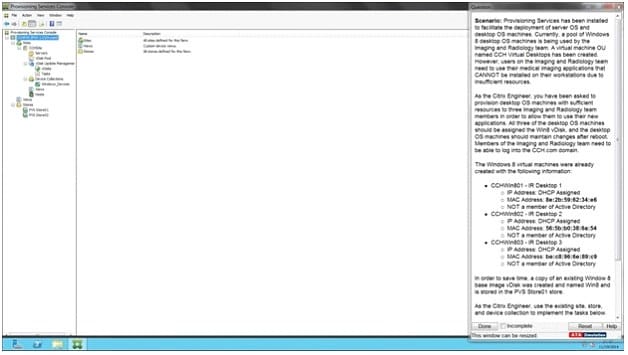 Scenario: Provisioning Services has been installed to facilitate the deployment of server OS and desktop OS machines. Currently, a pool of Windows 8 desktop OS machines is being used by the Imaging and Radiology team. A virtual machine OU named CCH Virtual Desktops has been created. However, users on the Imaging and Radiology team need to use their medical imaging applications that CANNOT be installed on their workstations due to insufficient resources.