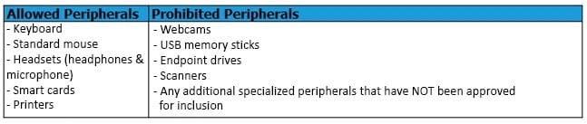 Scenario: After a recent security assessment, a Citrix Architect recommends blocking unnecessary peripheral types by disabling the associated HDX channels. Currently, the environment is intended to support the peripheral types listed in the Exhibit.