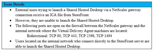 Scenario: A Citrix Architect needs to assess a NetScaler Gateway deployment that was recently completed by a customer and is currently in pre-production testing. The NetScaler Gateway needs to use ICA proxy to provide access to a XenApp and XenDesktop environment. During the assessment, the customer informs the architect that users are NOT able to launch published resources using the Gateway virtual server.