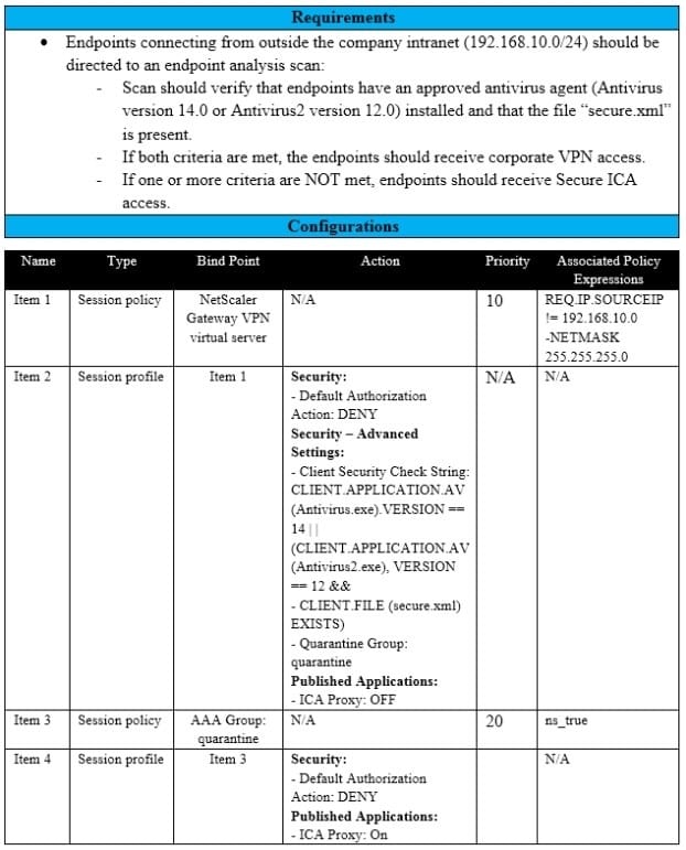 Scenario: A Citrix Architect needs to assess an existing on-premises NetScaler deployment which includes Advanced Endpoint Analysis scans. During a previous security audit, the team discovered that certain endpoint devices were able to perform unauthorized actions despite NOT meeting pre-established criteria.