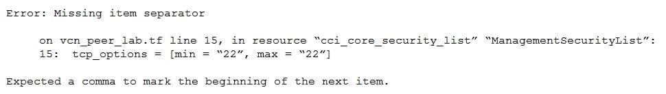 You have recently been asked to take over management of your company's infrastructure provisioning efforts, utilizing Terraform v0.12 to provision and manage infrastructure resources in Oracle Cloud Infrastructure (OCI). For the past few days the development environments have been failing to provision. Terraform returns the following error: You locate the related code block in the Terraform config and find the following: