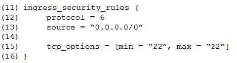 B. Modify line 15 to be the following: tcp_options = {min = “22”, max = “22”)
