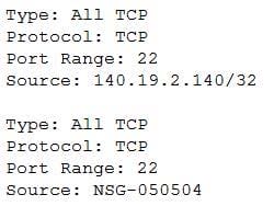 You set up a bastion host in your VCN to only allow your IP address (140.19.2.140) to establish SSH connections to your Compute Instances that are deployed in a private subnet. The Compute Instances have an attached Network Security Group with a Source Type: Network Security Group (NSG), Source NSG: NSG-050504. To secure the bastion host, you added the following ingress rules to its Network Security Group: