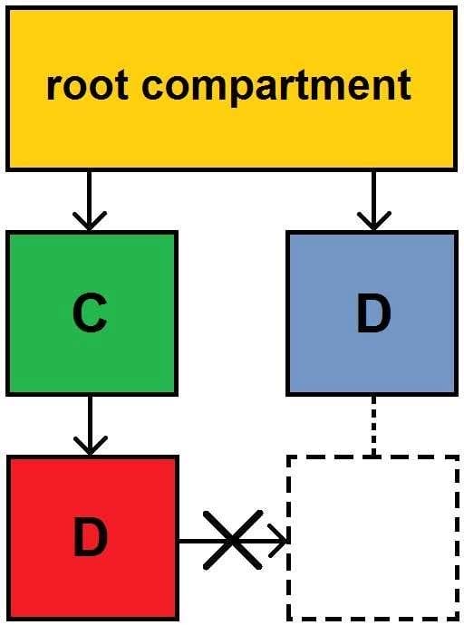 You have compartments C and D under the root compartment in your Oracle Cloud Infrastructure (OCI) tenancy; compartment C contains a sub-compartment also named D. You are trying to move this sub-compartment D to the parent compartment D like shown in the picture, but the move fails.