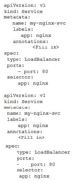 In the sample Kubernetes manifest file below, what annotations should you add to create a private load balancer In oracle Cloud infrastructure Container Engine for Kubermetes?