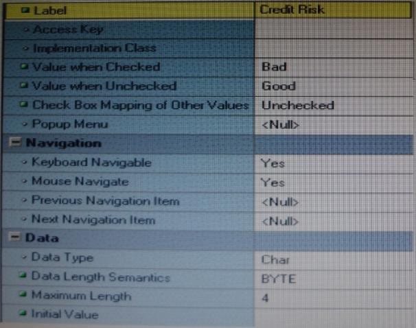You change the item type to Checkbox, set other properties as shown in the Exhibit, and then run your form and insert three records: two with good credit and the check box deselected, and one with poor credit and the check box selected. You commit the data and query the records, with the following result set: