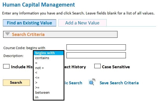 On the Human Capital Management search page, why is the Course Code field limited to accept only "begins with" searches, whereas the Description field accepts a wide range of search operators?