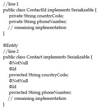 D. Add @Embeddable annotation at line 1 and @EmbeddedId(ContactId.class) at line 2.