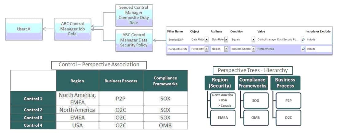 Which controls can user A access and manage for the following Control Manager role configuration? See details of perspective trees and control-perspective association below.