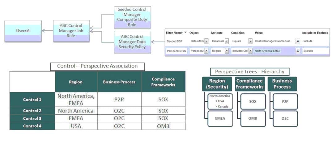 Which controls can user A manage for the following Control Manager role Configuration? See details of perspective trees and control-perspective association below.