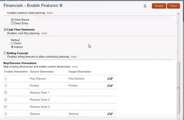 A company wants to enable Cash Flow within the Financials framework using a derived method based on Operating, Investing, and Financing activities.
