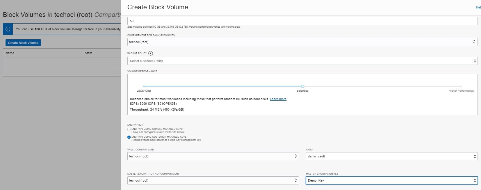 B. When you create a new block volume through OCI console, select Encrypt using Key Management checkbox and use encryption keys generated and stored in OCI Key Management Service.