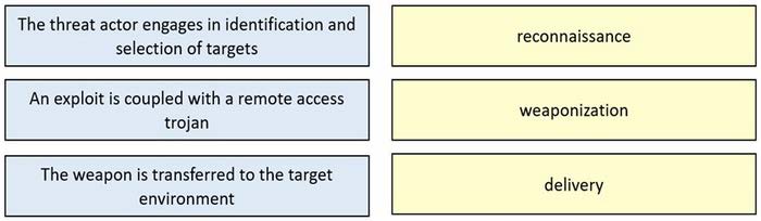 Drag and drop the definition from the left onto the phase on the right to classify intrusion events according to the Cyber Kill Chain model.
