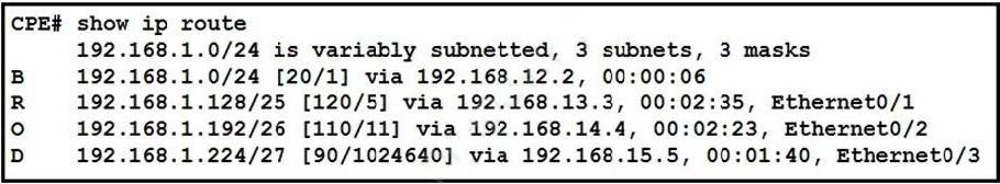 All traffic enters the CPE router from interface Serial0/3 with an IP address of 192.168.50.1. Web traffic from the WAN is destined for a LAN network where servers are load-balanced. An IP packet with a destination address of the HTTP virtual IP of 192.168.1.250 must be forwarded. Which routing table entry does the router use?