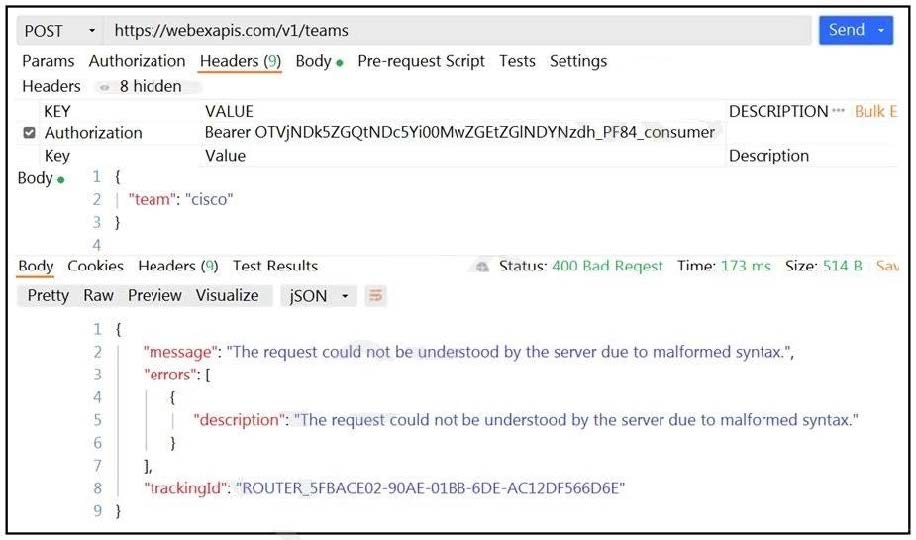 A developer wants to create a room named cisco through Webex API. The developer prepares the request by putting an API token inside the authorization header; however, the given HTTP call returns error code 400. How must the call parameters be changed to ensure a valid response?