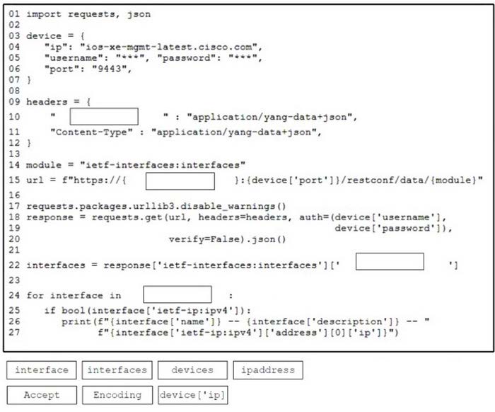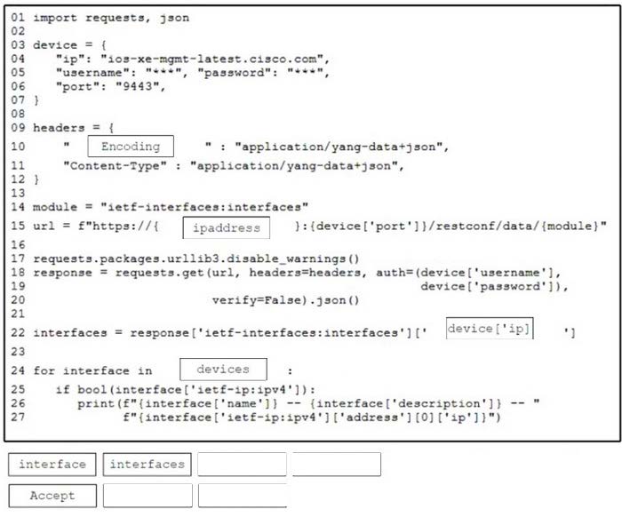 Drag and drop the code from the bottom onto the box where the code is missing to construct a Python script that allows an engineer to retrieve interface data. Not all options are used.