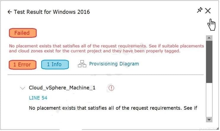 An administrator is testing a newly created Windows 2016 cloud template in Cloud Assembly. While using the Test option from within the cloud template, the attached error appears.