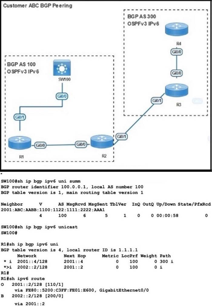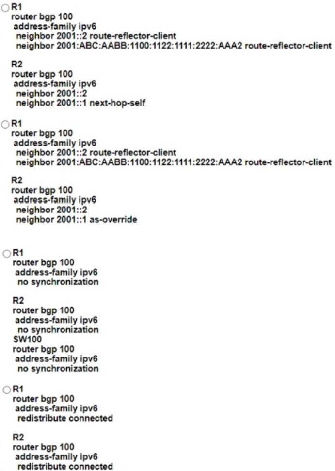 SW100 cannot receive routes from R1 Which configuration resolves the issue?