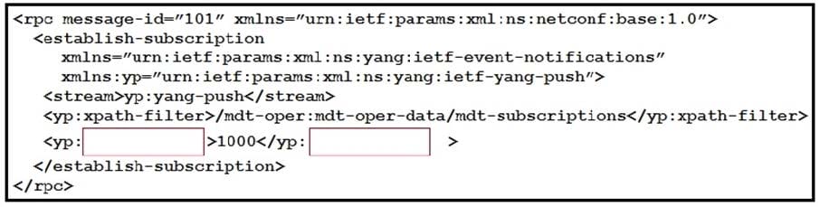 Refer to the exhibit. Which XML tag completes this NETCONF telemetry subscription with a Cisco IOS XE device?