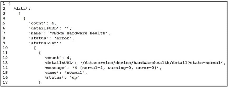 Refer to the exhibit. Cisco SD-WAN deployment must be troubleshooted using vManage APIs. A call to vEdge Hardware Health API returns the data in the exhibit (only a portion is shown). If this JSON is converted to a Python dictionary and assigned to the variable "d", how the status is accessed that is indicated on line 16?