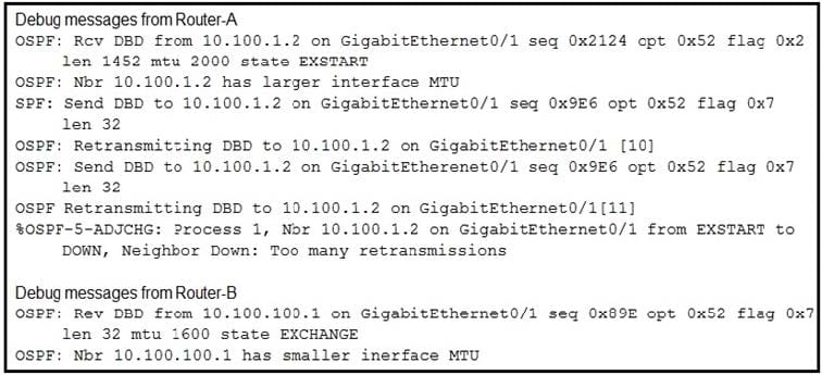 An OSPF adjacency between Router-A and Router-B cannot reach the FULL state. Which action resolves the issue?