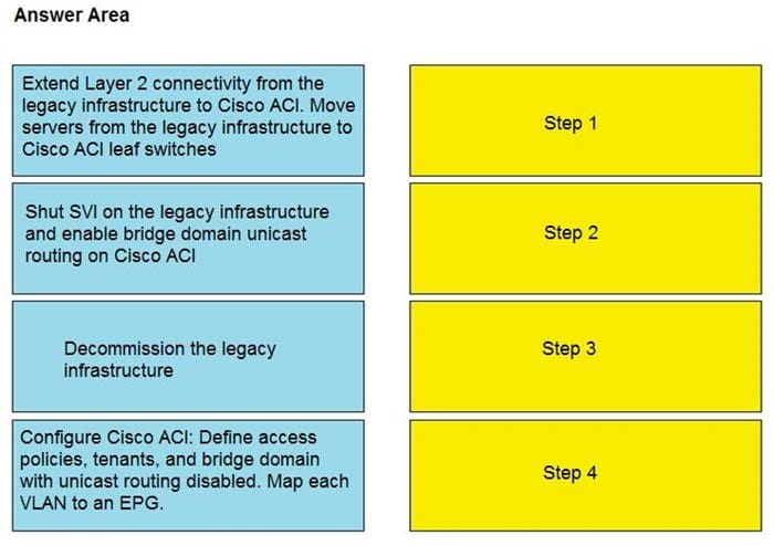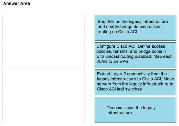 An engineer must migrate servers from a legacy data center infrastructure to a Cisco ACI fabric. Drag and drop the steps from the left into the order that they must be completed on the right to ensure the least amount of downtime.