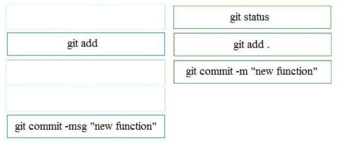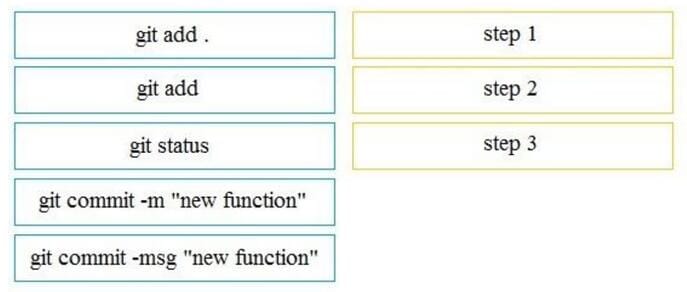 A file named myfunc.py has been edited. Drag and drop the steps from the left that ensure that this file is committed to the local Git repository and verify its status into the correct order on the right. Not all options are used.