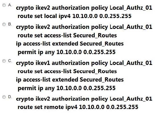 An engineer would like Cisco AnyConnect users to be able to reach servers within the 10.10.0.0/16 subnet while all other traffic is sent out to the Internet. Which IPsec configuration accomplishes this task?