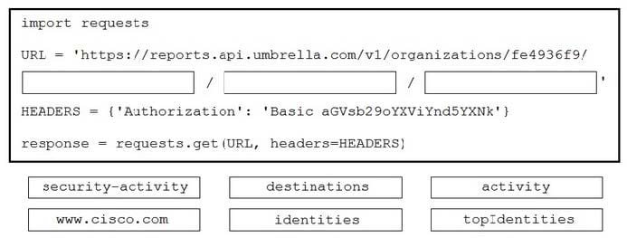 Drag and drop the code to complete the Cisco Umbrella Reporting API query to return the top identities. Not all options are used.