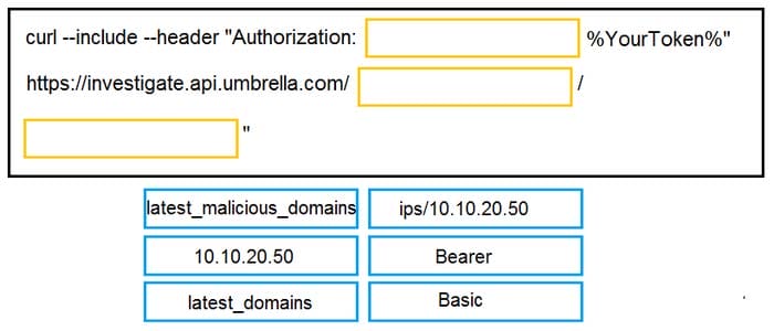 Drag and drop the code to complete the curl query to the Cisco Umbrella Investigate API for the Latest Malicious Domains for the IP address 10.10.20.50. Not all options are used.