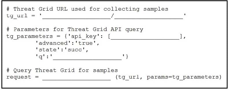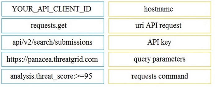 Drag and drop the elements from the left onto the script on the right that queries Cisco ThreatGRID for indications of compromise.