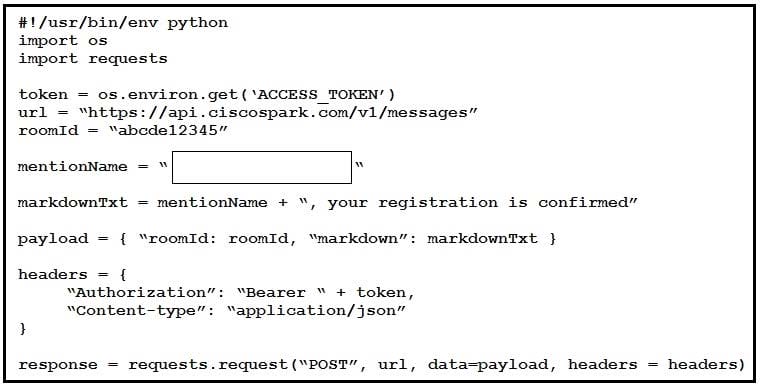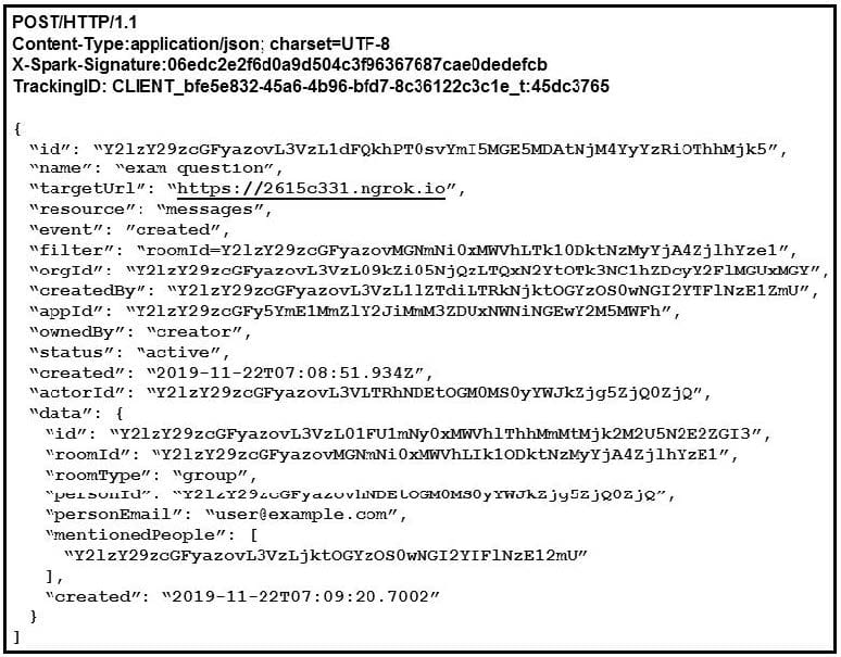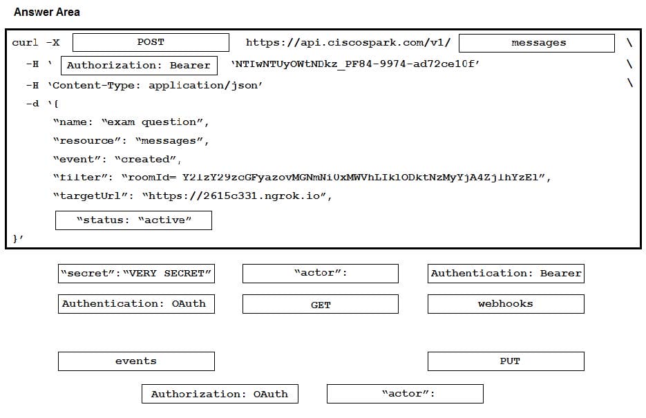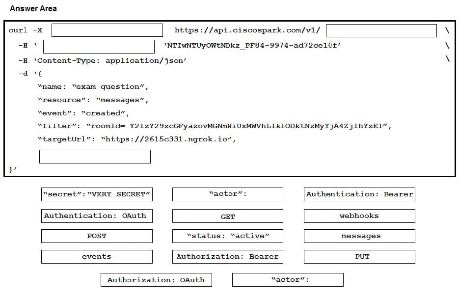 DRAG DROP Refer to the exhibit. A bot is receiving notifications such as the one displayed in the exhibit. Drag and drop the code onto the snippet to complete the API request that was sent to Webex Teams so that the bot will receive these notifications. Not all options are used.