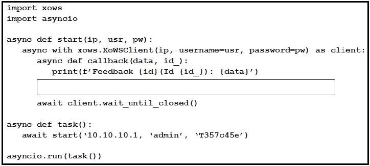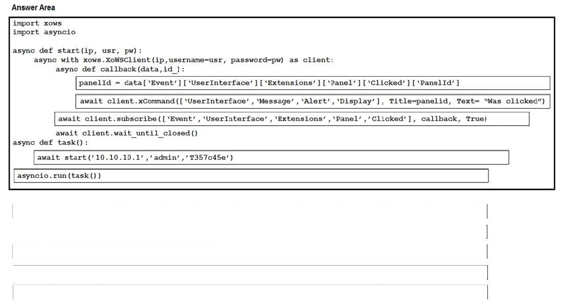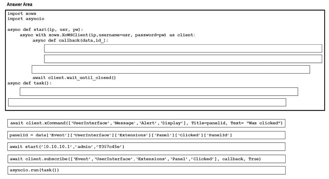 An administrator is creating a script using the Python xAPI over WebSockets (pyxows) library. The goal of the script is to capture an event generated by a UI Extensions action button (former In-Room Control Panel). When the action button is clicked, the script displays an alert that says that the button ID was clicked. Drag and drop the code snippets into the locations to complete the script: