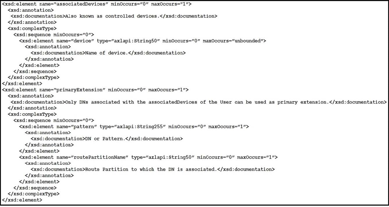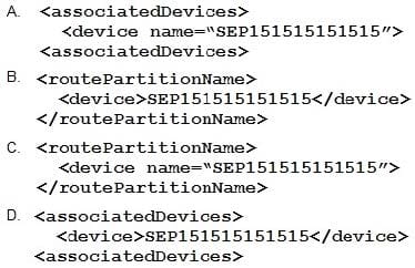 Refer to the exhibit. The exhibit shows the XML schema to associate a device for the AddUser operation in AXL. Which XML snippet is correct to associate a device with name "SEP151515151515"?