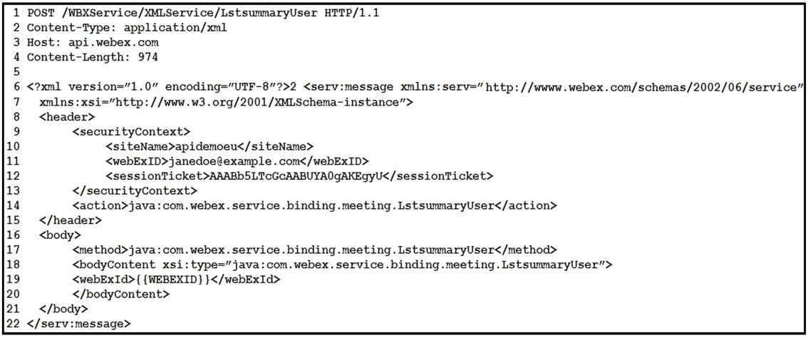 Refer to the exhibit. A Webex Meetings XML API HTTP request message with several invalid portions is shown. Which reference points to a line in the exhibit that correctly indicates that this is a LstsummaryUser request?