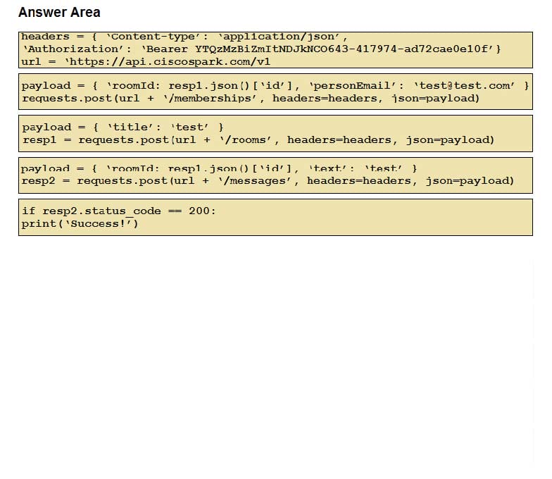 Drag and drop the code snippets into the correct order to create a Python Webex Teams REST API script that performs this sequence of tasks: create a Space, add a user to the Space, post the word “test” in the Space. Assume that the Python “requests” module has already been imported.