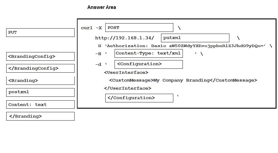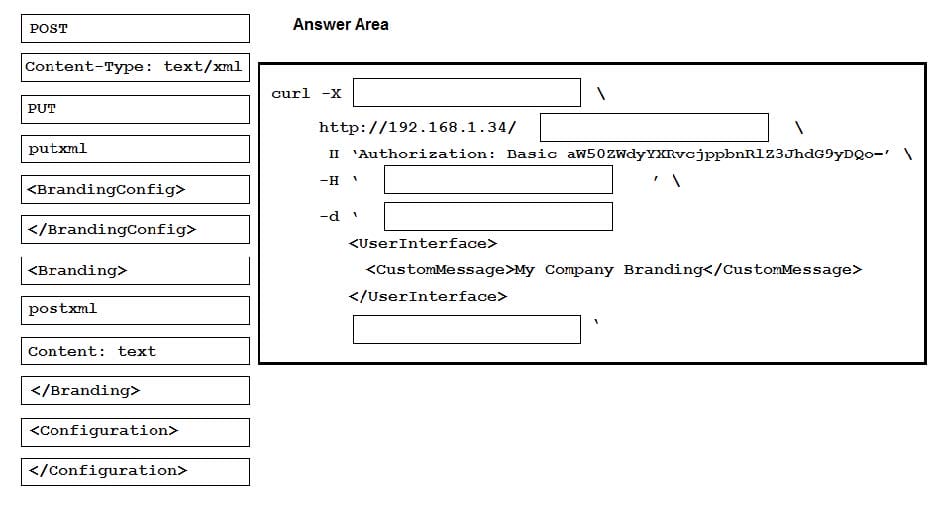 Drag and drop the commands from the left onto the curl command to create a custom branding message using the xAPI HTTP API. Not all options are used.