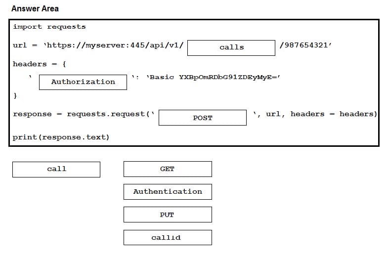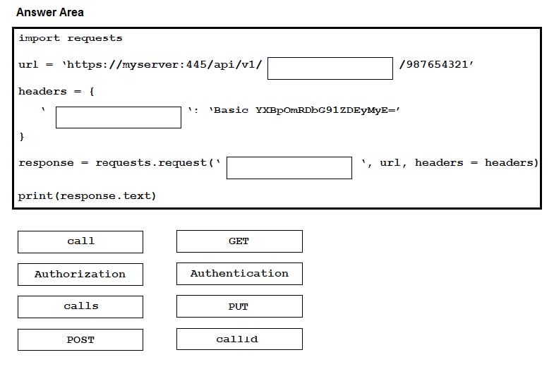 The Python script executes a REST API to retrieve information from the Cisco Meeting Server about the call with an identifier of “987654321”. Drag and drop the code onto the snippet to complete the Python script. Not all options are used.