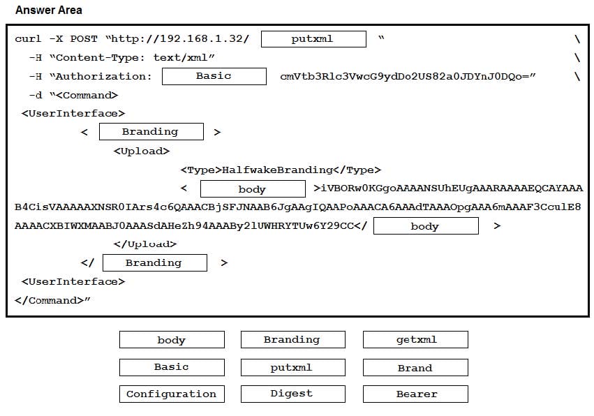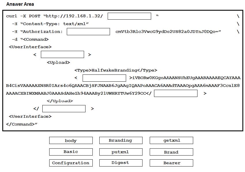 Drag and drop the code to complete the curl command that creates a halfwake brand logo using the xAPI HTTP API. Not all options are used. Code can be used more than one time.