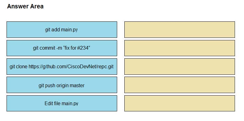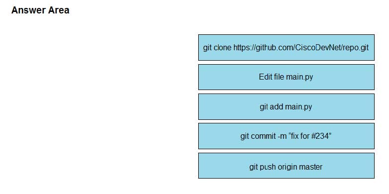 Drag and drop the git commands/steps from the left into the correct order on the right to make changes and submit code to a remote repository.
