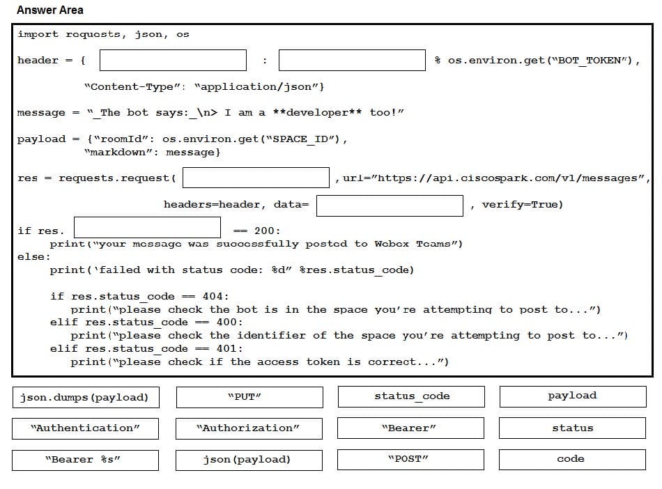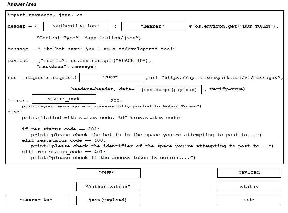 Refer to the exhibit. A developer has implemented ChatOps to a Webex Teams space as described in the exhibit. The Python script that pushes the notifications to the Teams space is shown. Drag and drop the code to complete the script. Not all options are used.