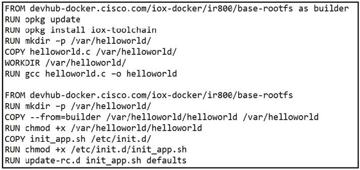 Refer to the exhibit. When a Docker image is built using this Dockerfile, which two statements are valid on Cisco IOx 1.8 and before? (Choose two.)