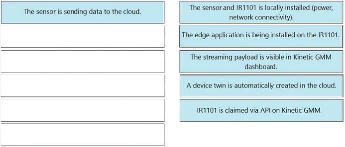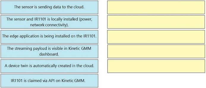 An engineering team developed a solution that gathers data via a proprietary protocol (TCP/IP based) to a IR1101 gateway, which then sends the data to the cloud. Drag and drop the action steps from the left into the correct order on the right to get this solution to operate. Not all options are used.