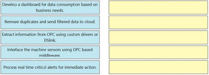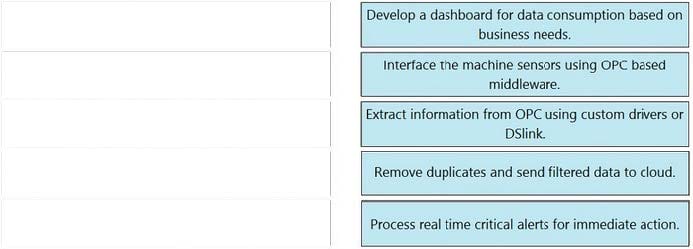 Drag and drop the tasks from the left into the correct order on the right for transporting data from sensors to the cloud, in order to extract the machine data and use the cloud-based analytics for predictive maintenance.