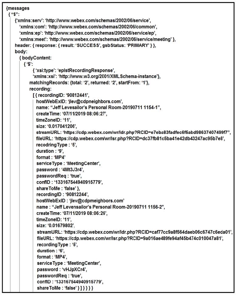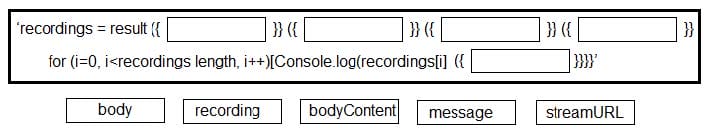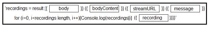 DRAG DROP Refer to the exhibit. A training coordinator must post links to Webex recordings on a company SharePoint site. This is usually a manual process, but a DevOps engineer wants to automate it using Webex XML APIs. After a sucessful LstRecording call wrapped in xml2js, the ‘console dir(result)’ output is shown in the exhibit. Using ‘dot notation’, drag and drop the code below onto the code snippet to output the streamURL for each recording.