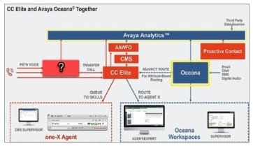 The exhibit shows a basic Avaya Oceana setup with Call Center Elite, showing a complete multi-touch solution with Call Center Elite serving customers via voice, and Oceana supporting email, chat, SMS, co-browsing and more.